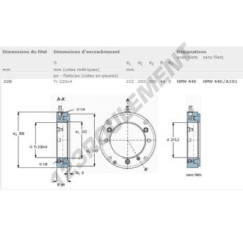 Cet écrou HMV44E-SKF possède un diamètre intérieur de 222mm, un diamètre extérieur de 306mm et une épaisseur de 44mm.