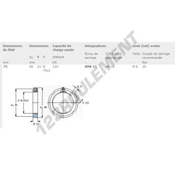 Cet écrou KMK15-SKF possède un diamètre intérieur de 75mm, un diamètre extérieur de 98mm et une épaisseur de 14mm.