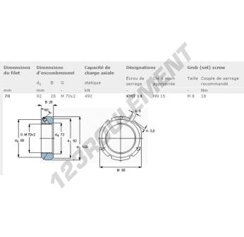 Cet écrou KMT14-SKF possède un diamètre intérieur de 70mm, un diamètre extérieur de 92mm et une épaisseur de 28mm.