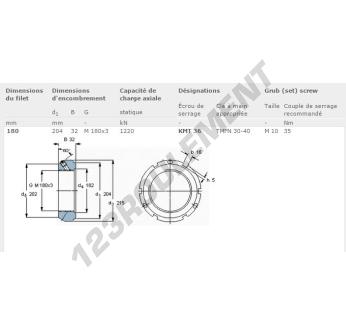 Cet écrou KMT36-SKF possède un diamètre intérieur de 180mm, un diamètre extérieur de 204mm et une épaisseur de 32mm.