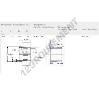 Le Manchon, connu sous la référence AOH2344-SKF SKF, possède un diamètre intérieur de 200 mm, un diamètre extérieur de 220 mm et une épaisseur de 181 mm.