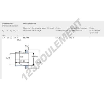 Le Manchon, connu sous la référence H304-SKF SKF, possède un diamètre intérieur de 17 mm, un diamètre extérieur de 32 mm et une épaisseur de 28 mm.