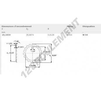 La Rondelle Frein de la marque SKF, connue sous la référence W04-SKF possède un diamètre intérieur de 2034 mm, un diamètre extérieur de 38.88 mm et une épaisseur de 0.81 mm.
