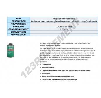 Le Loctite SF 7458 500ML est un activateur rapide de 500ML, spécialement conçu pour réduire le temps de séchage des adhésifs Loctite. Il permet une polymérisation rapide et optimale, même dans des environnements exigeants.