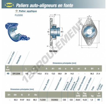 Le Palier - 2 Fixations connu sous la référence EXFLE208-SNR SNR possède un diamètre d'alésage de 40 mm et un entraxe de fixation de 172 mm. Cette référence est fabriquée en fonte et le type de serrage se fait par Bague de blocage excentrique.
