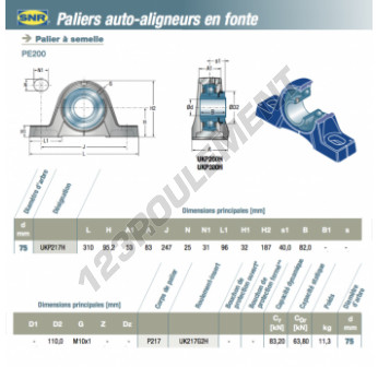Le Palier - 2 Fixations connu sous la référence UKP217H-SNR SNR possède un diamètre d'alésage de 75 mm et un entraxe de fixation de 247 mm. Cette référence est fabriquée en fonte et le type de serrage se fait par Manchon de serrage.