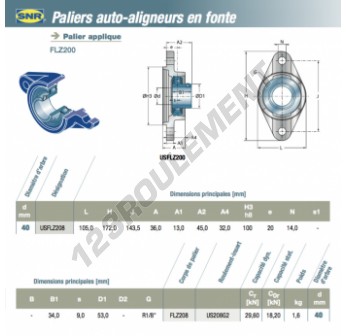 Le Palier - 2 Fixations connu sous la référence USFLZ208-SNR SNR possède un diamètre d'alésage de 40 mm et un entraxe de fixation de 143.5 mm. Cette référence est fabriquée en fonte et le type de serrage se fait par vis de blocage.