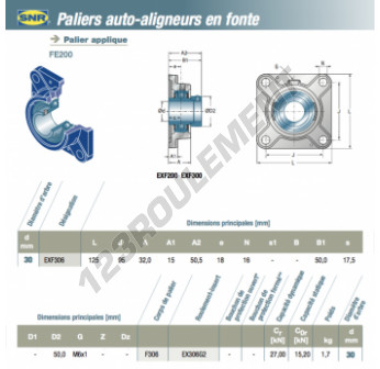 Le Palier - 4 Fixations connu sous la référence EXF306-SNR de la marque SNR possède un diamètre d'alésage de 30 mm et un entraxe de fixation de 95 mm. Cette référence est fabriquée en fonte et le type de serrage se fait par Bague de blocage excentrique.