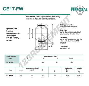 La Rotule Geew connue sous la référence DGE17-FW-DURBAL, de la marque DURBAL possède un diamètre intérieur de 17mm, un diamètre extérieur de 35mm et une épaisseur de 12mm.