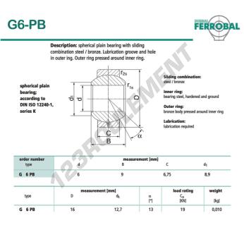 La Rotule Geew connue sous la référence G6-PB-DURBAL, de la marque DURBAL possède un diamètre intérieur de 6mm, un diamètre extérieur de 16mm et une épaisseur de 6.75mm.