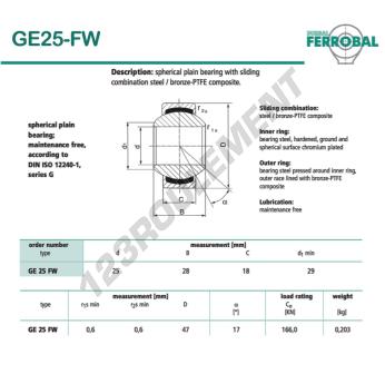 La Rotule Geew connue sous la référence GE25-FW-DURBAL, de la marque DURBAL possède un diamètre intérieur de 25mm, un diamètre extérieur de 47mm et une épaisseur de 18mm.