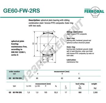 La Rotule Geew connue sous la référence GE60-FW-2RS-DURBAL, de la marque DURBAL possède un diamètre intérieur de 60mm, un diamètre extérieur de 105mm et une épaisseur de 40mm.