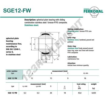 La Rotule Geew connue sous la référence SGE12-FW-DURBAL, de la marque DURBAL possède un diamètre intérieur de 12mm, un diamètre extérieur de 26mm et une épaisseur de 9mm.