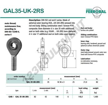 La Rotule Sa connue sous la référence DGAL35-UK-2RS-DURBAL, de la marque DURBAL possède un pas de vis de et un Filetage à gauche, un diamètre intérieur de 35mm, un diamètre extérieur de 82mm et une épaisseur de 25mm.