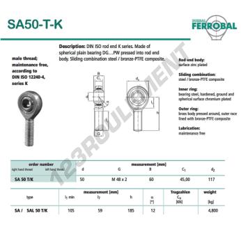 La Rotule Sa connue sous la référence SA50-T-K-DURBAL, de la marque DURBAL possède un pas de vis de et un Filetage à droite, un diamètre intérieur de 50mm, un diamètre extérieur de 117mm et une épaisseur de 60mm.