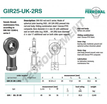La Rotule Si connue sous la référence DGIR25-UK-2RS-DURBAL, de la marque DURBAL possède un diamètre intérieur de 25mm, un diamètre extérieur de 64mm et une épaisseur de 20mm.