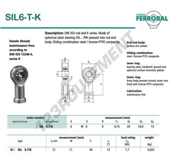 La Rotule Si connue sous la référence SIL6-T-K-DURBAL, de la marque DURBAL possède un diamètre intérieur de 6mm, un diamètre extérieur de 20mm et une épaisseur de 9mm.