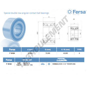 Le Roulement De Roue connu sous la référence F16124-ASFERSA, de la marque ASFERSA, possède un diamètre intérieur de 38mm, un diamètre extérieur de 72mm et une épaisseur de 40mm.
