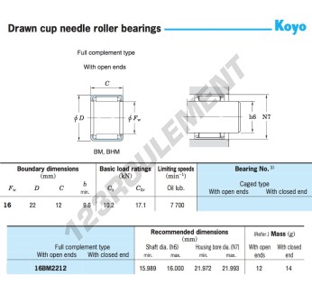 Le Roulement à Aiguilles, connu sous la référence 16BM2212-JTEKT, de la marque JTEKT, possède un diamètre intérieur de 16mm, un diamètre extérieur de 22mm et une épaisseur de 12mm.
