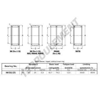 Le Roulement à Aiguilles, connu sous la référence NK5025A-JTEKT, de la marque JTEKT, possède un diamètre intérieur de 50mm, un diamètre extérieur de 62mm et une épaisseur de 25mm.