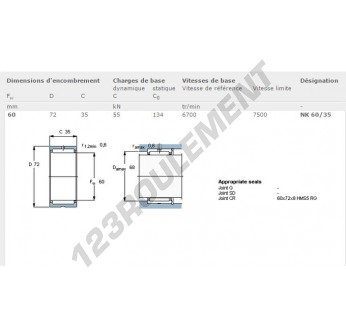 Le Roulement à Aiguilles, connu sous la référence NK6035-SKF, de la marque SKF, possède un diamètre intérieur de 60mm, un diamètre extérieur de 72mm et une épaisseur de 35mm.