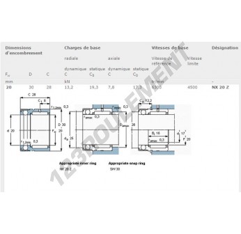 Le Roulement à Aiguilles, connu sous la référence NX20-Z-SKF, de la marque SKF, possède un diamètre intérieur de 20mm, un diamètre extérieur de 30mm et une épaisseur de 28mm.