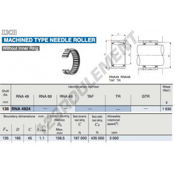 Le Roulement à Aiguilles, connu sous la référence RNA4924-IKO, de la marque IKO, possède un diamètre intérieur de 135mm, un diamètre extérieur de 165mm et une épaisseur de 45mm.