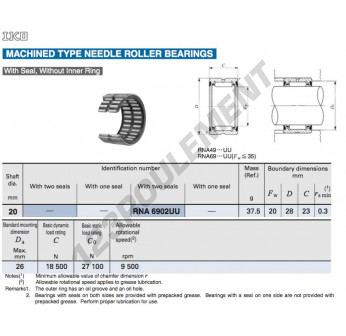 Le Roulement à Aiguilles, connu sous la référence RNA6902-UU-IKO, de la marque IKO, possède un diamètre intérieur de 20mm, un diamètre extérieur de 28mm et une épaisseur de 23mm.