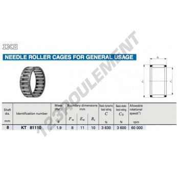 La Cage à Aiguilles, connue sous la référence KT81110C3-IKO, de la marque IKO, possède un diamètre intérieur de 8 mm, un diamètre extérieur de 11 mm et une épaisseur de 10 mm.