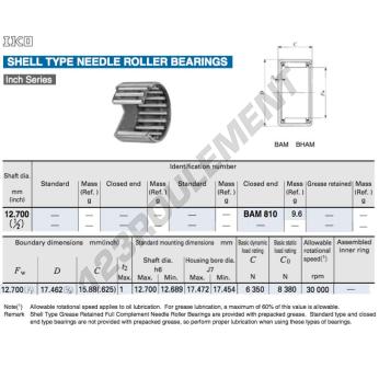 La Douille à Aiguilles, connue sous la référence BAM810-IKO, de la marque IKO, possède un diamètre intérieur de 12.7 mm, un diamètre extérieur de 17.46 mm et une épaisseur de 15.88 mm.