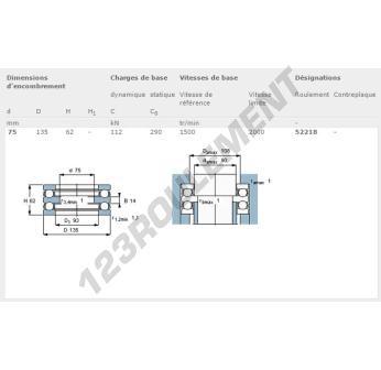 La Butée à Billes, connue sous la référence 52218-SKF, de la marque SKF, possède un diamètre intérieur de 75mm, un diamètre extérieur de 135mm et une épaisseur de 62mm.