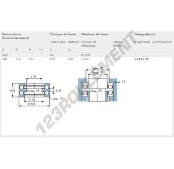La Butée à Billes, connue sous la référence 52412-M-SKF, de la marque SKF, possède un diamètre intérieur de 50mm, un diamètre extérieur de 130mm et une épaisseur de 93mm.