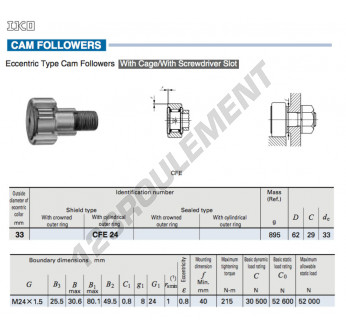 Le Galet De Came Avec Axe, connu sous la référence CFE24-IKO, de la marque IKO, possède un diamètre intérieur de 33mm, un diamètre extérieur de 62mm et une épaisseur de 29mm.