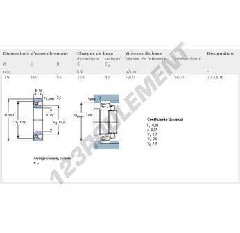 Le Roulement à Rotule Sur Billes, connu sous la référence 2315-K-SKF, de la marque SKF, possède un diamètre intérieur de 75mm, un diamètre extérieur de 160mm et une épaisseur de 55mm.