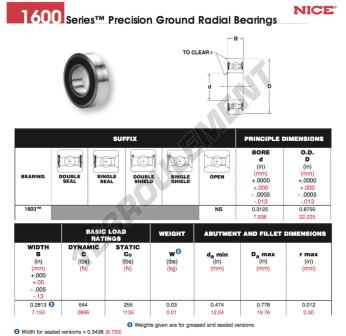Le Roulement à Billes, connu sous la référence 1603-NS-NICE, de la marque NICE, possède un diamètre intérieur de 7.938mm, un diamètre extérieur de 22.225mm et une épaisseur de 7.15mm.