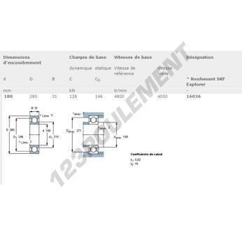Le Roulement à Billes, connu sous la référence 16036-SKF, de la marque SKF, possède un diamètre intérieur de 180mm, un diamètre extérieur de 280mm et une épaisseur de 31mm.