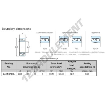 Le Roulement à Billes, connu sous la référence 24156-RHA-JTEKT, de la marque JTEKT, possède un diamètre intérieur de 280mm, un diamètre extérieur de 460mm et une épaisseur de 180mm.