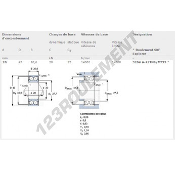 Le Roulement à Billes, connu sous la référence 3204-A-2Z-TN9-MT33-SKF, de la marque SKF, possède un diamètre intérieur de 20mm, un diamètre extérieur de 47mm et une épaisseur de 20.6mm.