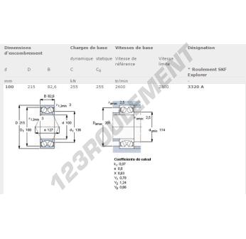 Le Roulement à Billes, connu sous la référence 3320-A-SKF, de la marque SKF, possède un diamètre intérieur de 100mm, un diamètre extérieur de 215mm et une épaisseur de 82.6mm.