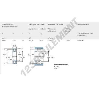 Le Roulement à Billes, connu sous la référence 61836-SKF, de la marque SKF, possède un diamètre intérieur de 180mm, un diamètre extérieur de 225mm et une épaisseur de 22mm.