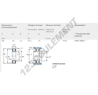 Le Roulement à Billes, connu sous la référence 6307-2RS-SKF, de la marque SKF, possède un diamètre intérieur de 35mm, un diamètre extérieur de 80mm et une épaisseur de 21mm.