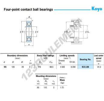 Le Roulement à Billes, connu sous la référence 6311BI-JTEKT, de la marque JTEKT, possède un diamètre intérieur de 55mm, un diamètre extérieur de 120mm et une épaisseur de 29mm.