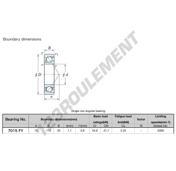 Le Roulement à Billes, connu sous la référence 7015-FY-JTEKT, de la marque JTEKT, possède un diamètre intérieur de 75mm, un diamètre extérieur de 115mm et une épaisseur de 20mm.