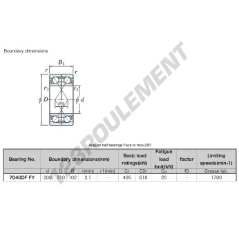 Le Roulement à Billes, connu sous la référence 7040-DF-FY-JTEKT, de la marque JTEKT, possède un diamètre intérieur de 200mm, un diamètre extérieur de 310mm et une épaisseur de 102mm.