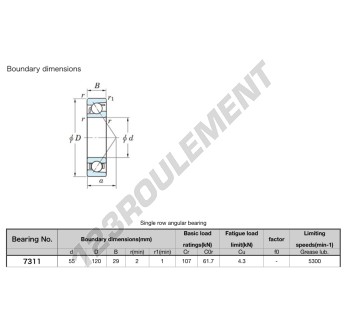 Le Roulement à Billes, connu sous la référence 7311-JTEKT, de la marque JTEKT, possède un diamètre intérieur de 55mm, un diamètre extérieur de 120mm et une épaisseur de 29mm.
