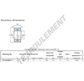 Le Roulement à Billes, connu sous la référence 7314-CDB-FY-JTEKT, de la marque JTEKT, possède un diamètre intérieur de 70mm, un diamètre extérieur de 150mm et une épaisseur de 70mm.