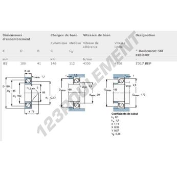 Le Roulement à Billes, connu sous la référence 7317-BEP-SKF, de la marque SKF, possède un diamètre intérieur de 85mm, un diamètre extérieur de 180mm et une épaisseur de 41mm.