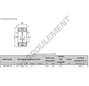 Le Roulement à Billes, connu sous la référence 7412-DF-FY-JTEKT, de la marque JTEKT, possède un diamètre intérieur de 60mm, un diamètre extérieur de 150mm et une épaisseur de 70mm.