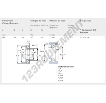 Le Roulement à Billes, connu sous la référence QJ208-MA-SKF, de la marque SKF, possède un diamètre intérieur de 40mm, un diamètre extérieur de 80mm et une épaisseur de 18mm.