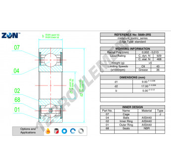 Le Roulement à Billes, connu sous la référence S689-2RS-ZEN, de la marque ZEN, possède un diamètre intérieur de 9mm, un diamètre extérieur de 17mm et une épaisseur de 5mm.